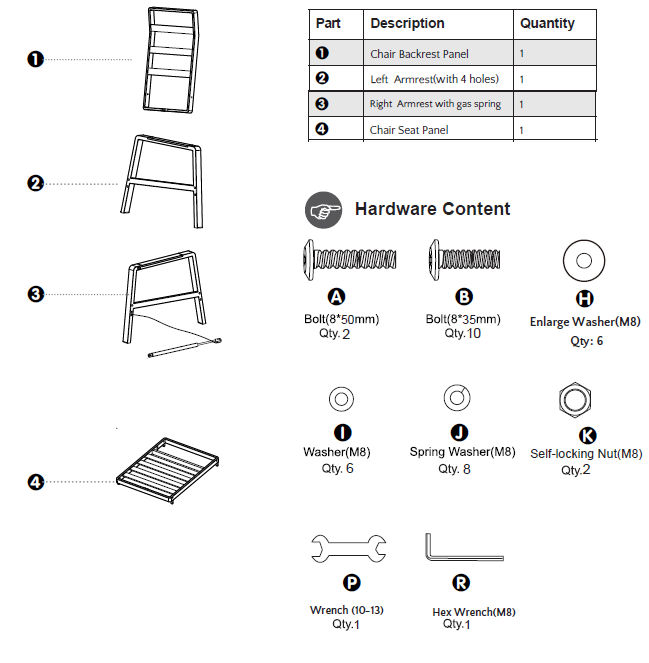 Placera Ryggstödspanel (Del 1) på det tidigare monterade Höger armstöd (med gasfjäder) (Del 3) och Stolsits Panel (Del 4).